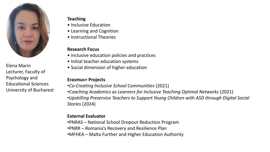 Elena Marin is a tenured lecturer at the Faculty of Psychology and Educational Sciences, University of Bucharest, in the Department of Educational Sciences, where she teaches courses (Cognition and Learning; Professional and Career Development Systems; Social Pedagogy) and seminars (Classroom Management; Special Educational Needs).