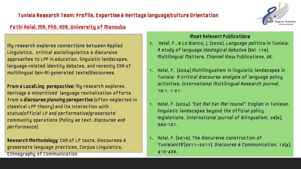 Fethi Helal holds a PhD & HDR in Applied Linguistics from the university of Manouba, Tunisia. His work has appeared in international journals such as Critical Discourse Studies, Discourse & Communication, international Multilingual Research Journal and the International Journal of Bilingualism. He is also the lead author of a book-length treatment of Language politics in Tunisia, published in collaboration with Professor Emiritus Joseph Lo Bianco (university of Melbourne, Australia) by Multilingual Matters in 2025. Helal’s specialization is in discourse-oriented language policy & planning tied to solving practical language problems in multilingual and conflict-ridden language settings such as in the Maghreb.