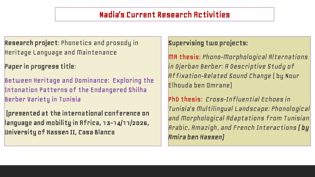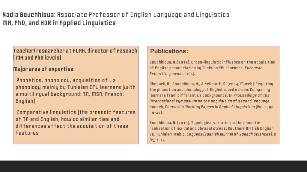 Professor Nadia Bouchhioua is a Tunisia Associate Professor and researcher at the Faculty of Letters, Arts and Humanities, University of Manouba, Tunisia. She holds a PhD degree and HDR in English language and linguistics. She has been teaching various English courses at the university level for more than twenty years. She supervises and evaluates MA and PhD research. Pr. Bouchhioua is previous chair of the MA program and member of the scientific council in her home institution. She is currently a member of the doctoral and HDR committee and director of research at her institution and member of the accreditation and evaluation committee (ATEA) at the Ministry of Higher Education in her country. She is the author of two books and 15 research articles. Her research interests and publications revolve around multilingualism, cross linguistic transfer, second language phonological acquisition, as well as the documentation and acquisition of local and heritage languages.