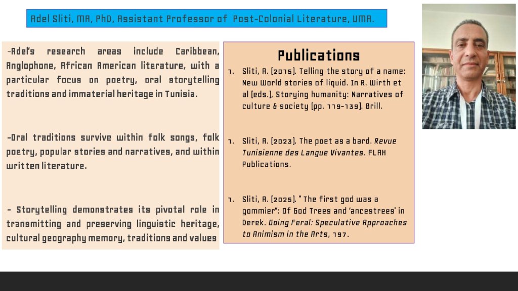 Adel Sliti is Assistant Professor at Manouba University, Tunisia. His PhD dissertation examined Derek Walcott’s poetics of survival, while his MA focused on E. E. Cummings’s nonconformist poetry. His research interests include Anglophone, Caribbean, Arab, and American literature, as well as women’s poetry. He has participated in conferences in Tunisia and abroad, and his work has appeared in international journals and edited books. His research explores the intersections of literature, orature, language, storytelling, literary genre, identity, and cultural memory.